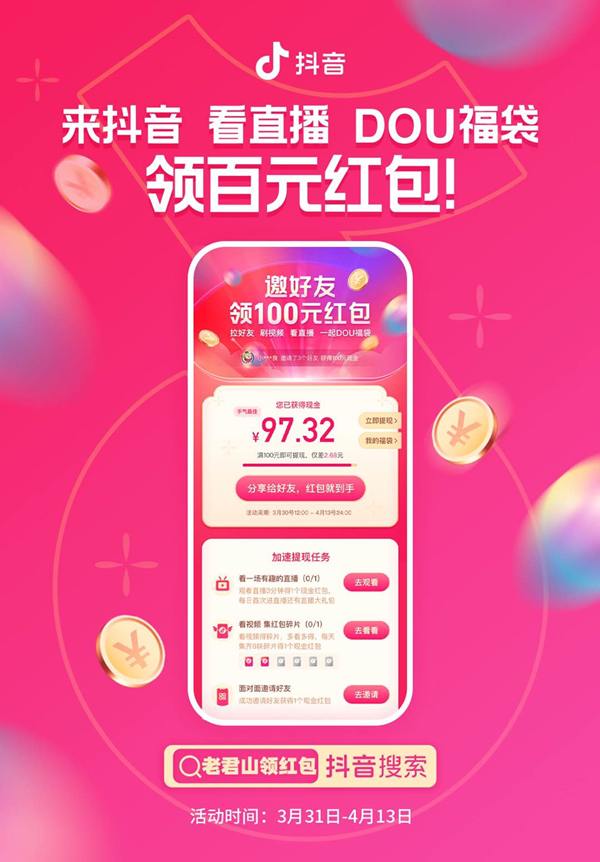 現(xiàn)在起,打開抖音App,搜索關(guān)鍵詞“老君山領(lǐng)紅包”,進(jìn)入活動(dòng)專屬頁面,邀請(qǐng)好友更有機(jī)會(huì)領(lǐng)取百元紅包,趕快帶上你的好友參與吧!