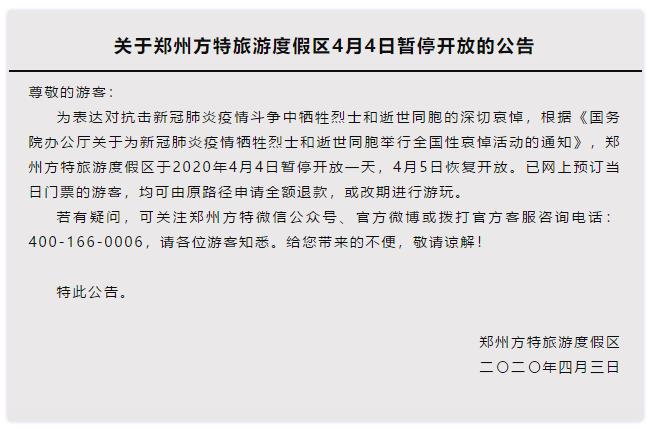 根據(jù)《國務院辦公廳關于為新冠肺炎疫情犧牲烈士和逝世同胞舉行全國性哀悼活動的通知》,為表達對抗擊新冠肺炎疫情斗爭犧牲烈士和逝世同胞的深切哀悼,鄭州方特旅游度假區(qū)于2020年4月4日閉園一天,暫停對外開放,4月5日恢復營業(yè)。請游客提前做好安排。