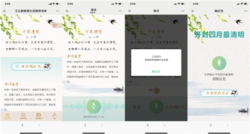 在“全民讀詩喊紅包”模塊中,您可以挑選一首心儀的詩詞,點(diǎn)擊詩作朗讀完畢,將您的讀詩作品上傳到“詩韻開封”參與熱門評(píng)選;發(fā)布成功后,您將收到喊紅包的資格提示,用普通話喊出“開封四月最清明”的口令信息,即可領(lǐng)取隨機(jī)金額的現(xiàn)金紅包。