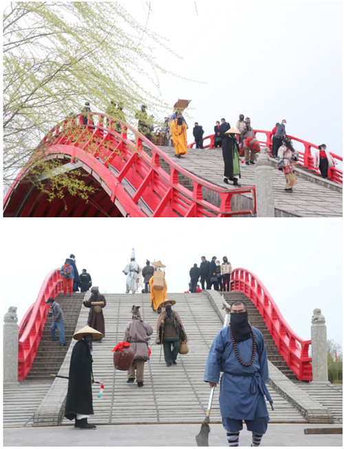 虹橋上,有僧人、劍客、腳夫穿梭而行,呈現(xiàn)出一片祥和、歡樂的情景。