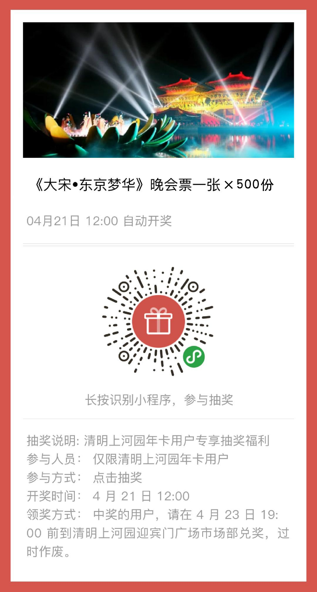 注意:此福利僅限清明上河園年卡用戶才可參與,非年卡用戶參與無效,采取實(shí)名制領(lǐng)獎(jiǎng),截屏、轉(zhuǎn)贈(zèng)、代領(lǐng)無效。