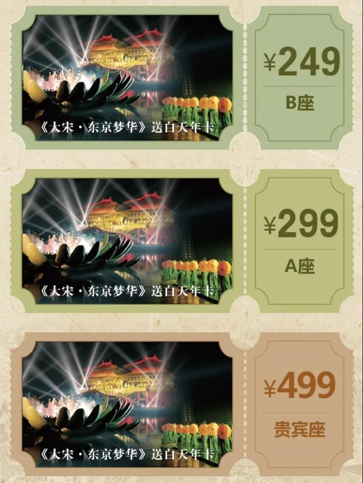 如:249元/人=249元/人(當(dāng)日《大宋·東京夢華》晚會(huì)入場券)+128元/人(免費(fèi)白天年卡)+120元/人(當(dāng)日白天入園門票)
