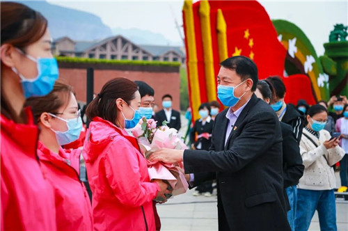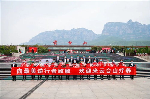 早上9點25分,援鄂醫(yī)療隊療養(yǎng)歡迎儀式在云臺山景區(qū)百家?guī)r廣場舉行。焦作市政府副秘書長王恒進主持歡迎儀式,首先對援鄂醫(yī)療隊員不懼風(fēng)險、勇敢逆行的精神致以崇高的敬意,對他們家人的理解支持和默默付出表示誠摯的謝意。隨后,焦作市衛(wèi)生健康委主任楊吉喜向援鄂醫(yī)療隊全體隊員贈送鮮花,焦作市文化廣電和旅游局黨組書記米紀文向援鄂醫(yī)療隊全體隊員頒發(fā)“焦作市文化旅游健康使者”證書,最后云臺山景區(qū)管理局局長馬春明代表云臺山全體員工向援鄂醫(yī)療隊全體隊員發(fā)出誠摯邀請,并發(fā)放云臺山旅游年票和景區(qū)吉祥物云逗逗。焦作市衛(wèi)生健康委副主任薛慧慶,焦作市文化廣電和旅游局副局長李建陽,云臺山景區(qū)管理局黨委書記郭曉黎,以及景區(qū)全體班子成員和職工代表參加此次歡迎儀式。