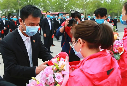 焦作市衛(wèi)生健康委主任楊吉喜向援鄂醫(yī)療隊全體隊員贈送鮮花▼