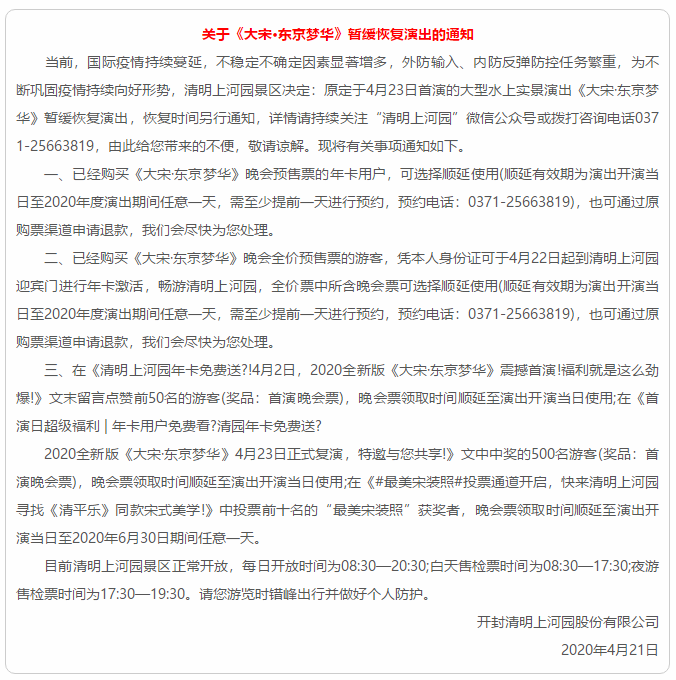 當(dāng)前,國際疫情持續(xù)蔓延,不穩(wěn)定不確定因素顯著增多,外防輸入、內(nèi)防反彈防控任務(wù)繁重,為不斷鞏固疫情持續(xù)向好形勢,記者從清明上河園景區(qū)獲悉,原定于4月23日首演的大型水上實景演出《大宋·東京夢華》暫緩恢復(fù)演出,恢復(fù)時間另行通知,詳情請持續(xù)關(guān)注“清明上河園”微信公眾號或撥打咨詢電話0371-25663819,由此給您帶來的不便,敬請諒解。現(xiàn)將有關(guān)事項通知如下。