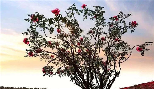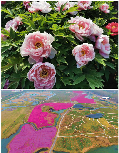 兩株千年牡丹花開正艷、絢麗多彩,陣陣花香沁人心脾令人陶醉,從空中俯瞰,五顏六色的牡丹花次第開放,妖嬈的花朵掩映在綠色的枝葉中,一團團,一簇簇,可謂“百花”齊放、香氣四溢。