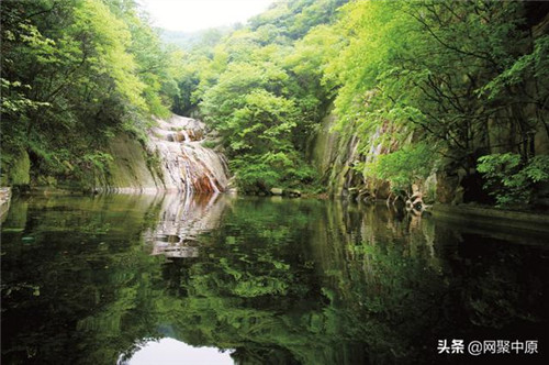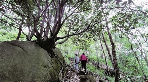 沿秀女潭一側(cè)拾階而上,路上見(jiàn)有長(zhǎng)在石頭上的樹(shù),有形似報(bào)曉峰的山石,有像大猩猩的臉一樣的樹(shù)皮。溯溪而上,峽谷深邃,石壁聳立,路徑百轉(zhuǎn)千回,參天樹(shù)木、嶙峋怪石以及奇樹(shù)瑤草相互映襯著。立于山谷中,聆聽(tīng)山澗瀑布聲,美不勝收。