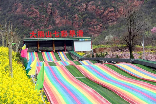 七彩滑道全長(zhǎng)206米,是由七種顏色組合而成的旱地滑雪體驗(yàn)項(xiàng)目,游客從色彩斑斕的滑道上飛流而下,驚險(xiǎn)、刺激、好玩。