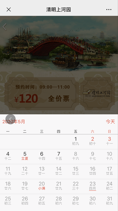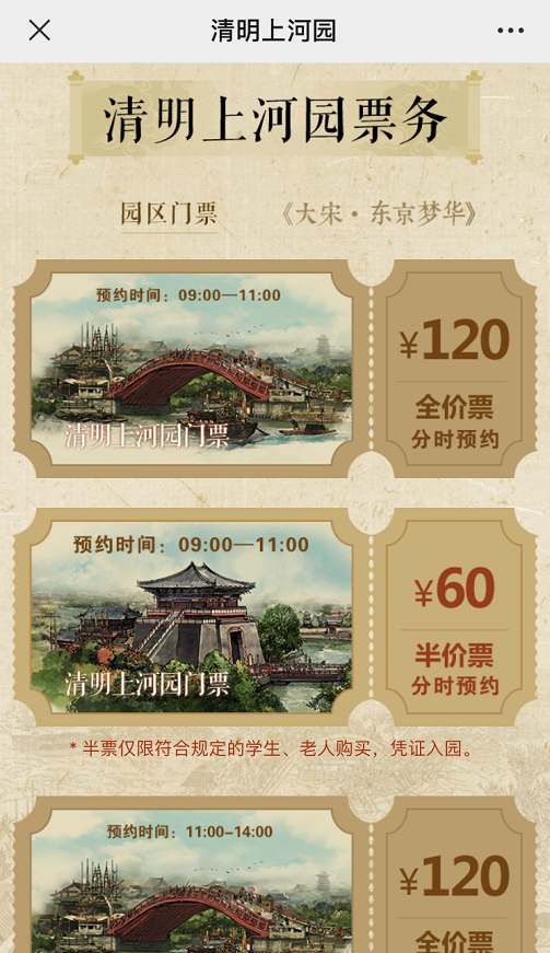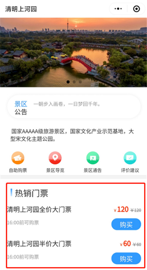 進(jìn)入清明上河園小程序主頁(yè)面,根據(jù)需求點(diǎn)擊清明上河園全價(jià)票/半價(jià)票。