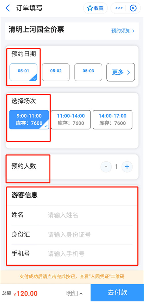 選擇您要預(yù)約的時(shí)間(點(diǎn)擊“更多”顯示更多日期),選擇入園時(shí)間段,預(yù)約人數(shù),輸入購(gòu)買人身份信息(一定要在您預(yù)約的入園時(shí)間段入園噢)。