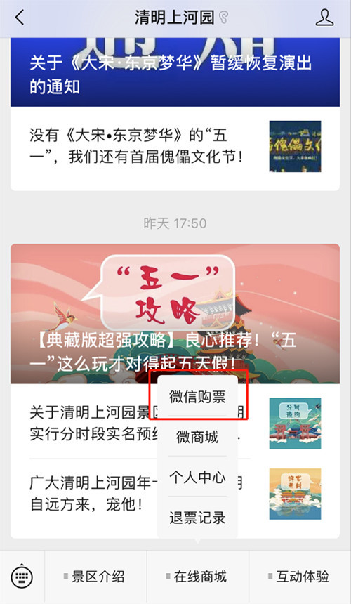 搜索“清明上河園”公眾號(hào),點(diǎn)擊“微信購(gòu)票”。