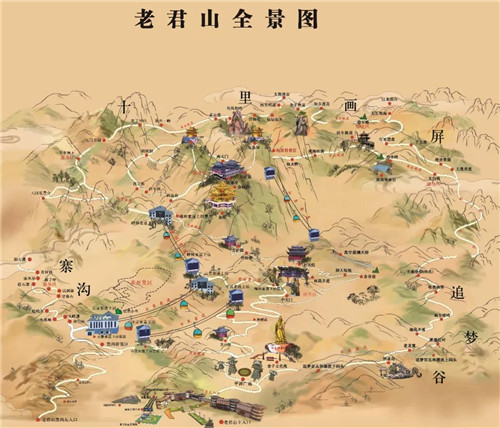 目前已形成了以老君山為主線,以寨溝、追夢(mèng)谷為兩翼,以游客中心綜合服務(wù)區(qū)、老子文化苑體驗(yàn)區(qū)、金頂?shù)烙^祭拜朝圣區(qū)、十里畫(huà)屏精品游覽區(qū)、舍身崖自然觀賞區(qū)、追夢(mèng)谷原始生態(tài)探險(xiǎn)區(qū)、寨溝養(yǎng)生休閑度假區(qū)共七大游覽區(qū)。