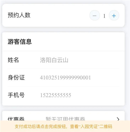 預(yù)定好入園時(shí)間,在訂單填寫頁面,需要填寫游客信息,根據(jù)一票一證原則,一個(gè)身份證對(duì)應(yīng)一張票,即可提交訂單。
