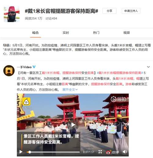 清明上河園將大宋文化和防疫工作創(chuàng)新結(jié)合,推出1.2米大宋狀元帽,上面特印有“本狀元名草有主,小姐姐保持距離”、“眾卿保持距離、不要過分親密”等趣味字樣時刻提醒游客與他人保持安全距離。