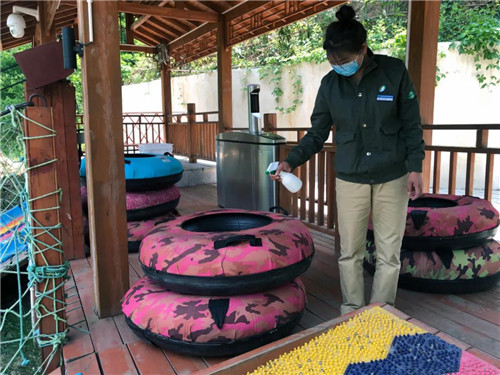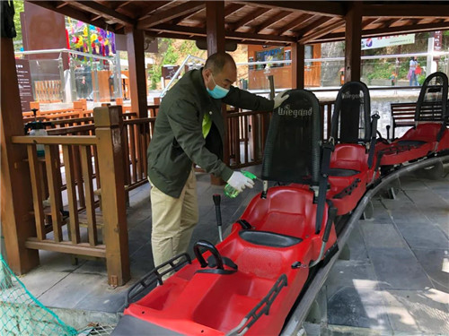 除了定時進行大消殺外,景區(qū)工作人員對游客頻繁接觸的扶手、安全帶等位置實施每客一消毒。