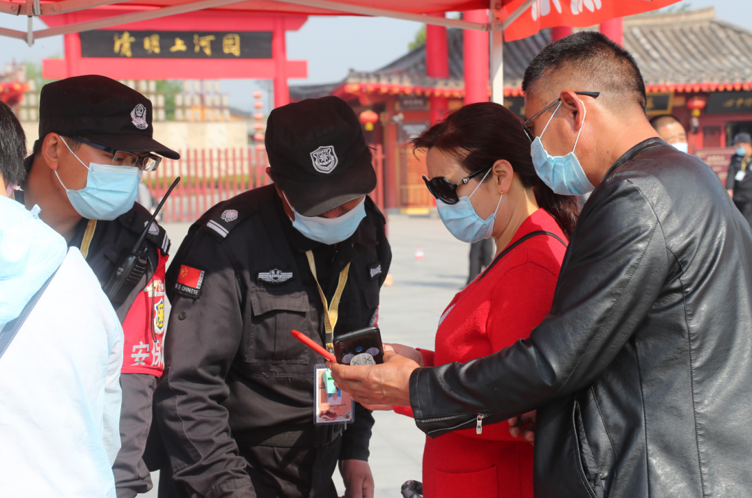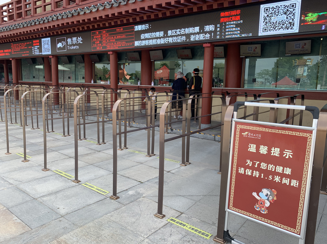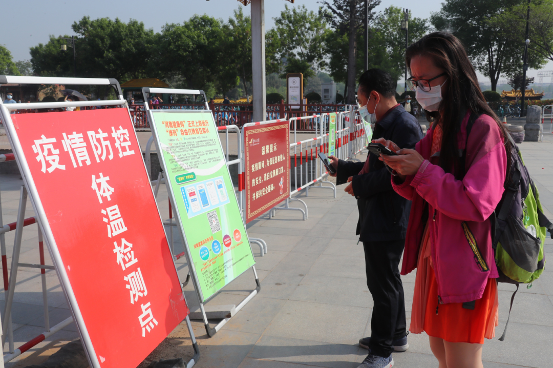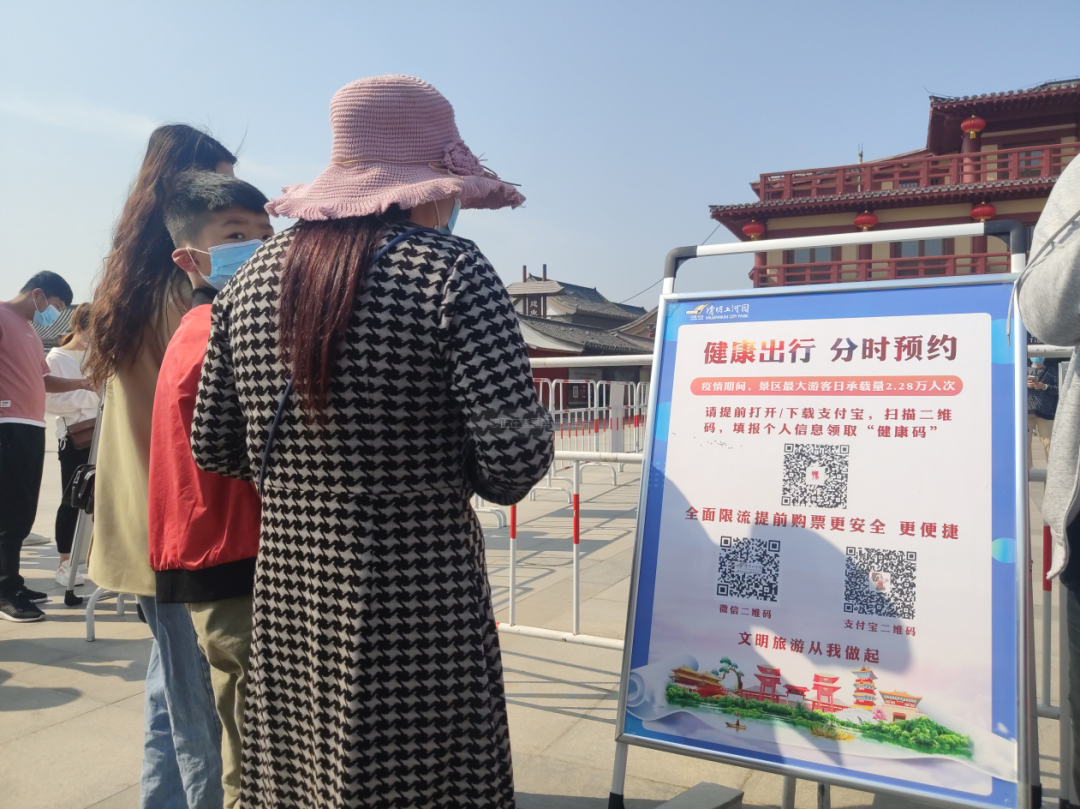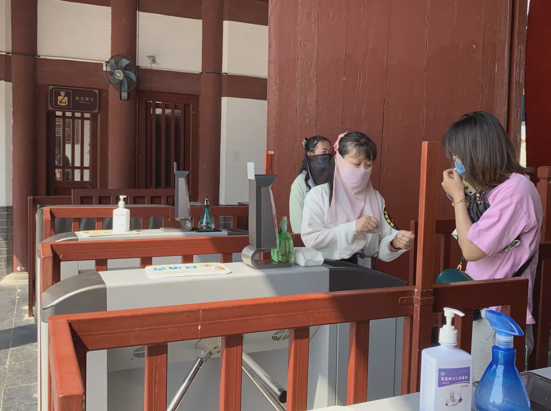 準備進入景區(qū)的游客排隊出示“綠色健康碼”、測量體溫、1.5米安全間隔、信息登記、文明旅游貼標、井然有序,做到了方便、快捷。