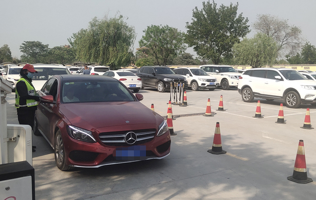 不少游客選擇自駕來到清明上河園,為確保車輛進出有序,工作人員不間斷在出入口指揮引導。