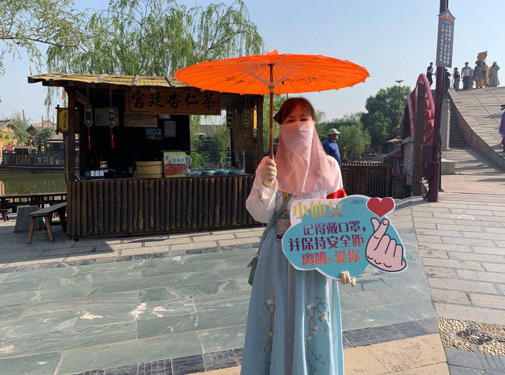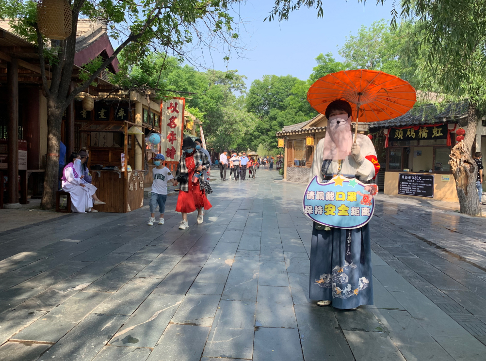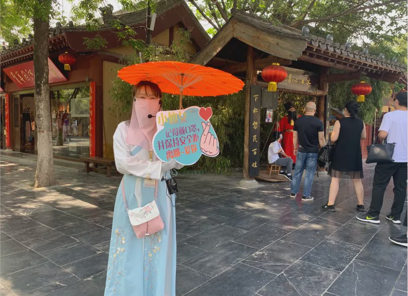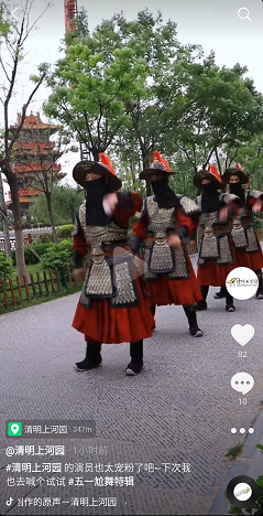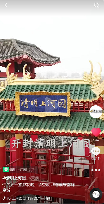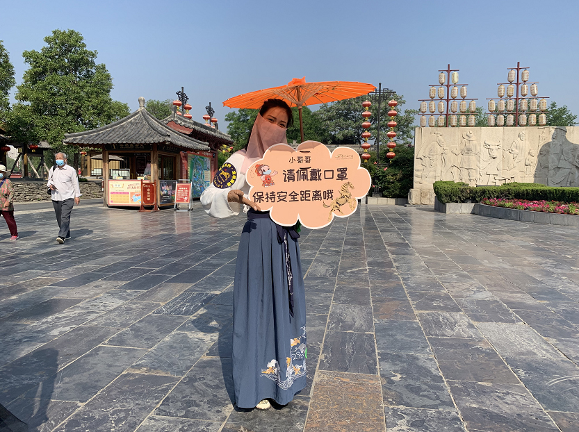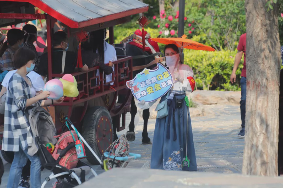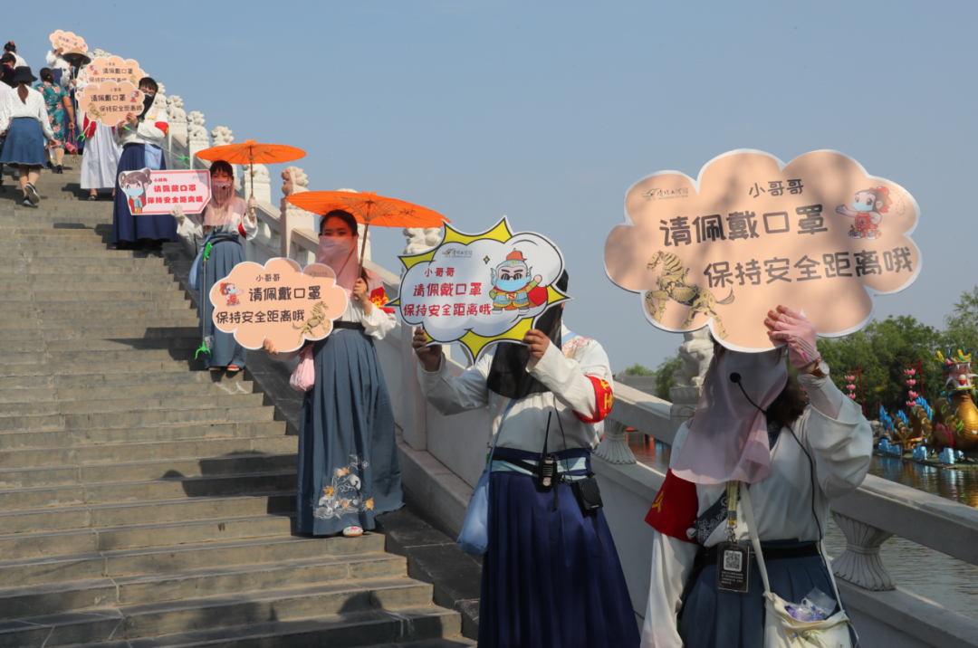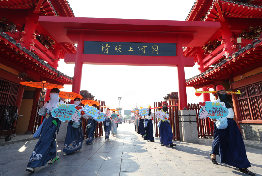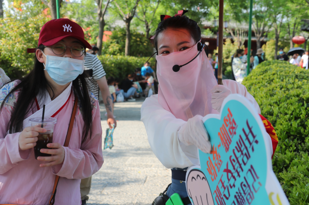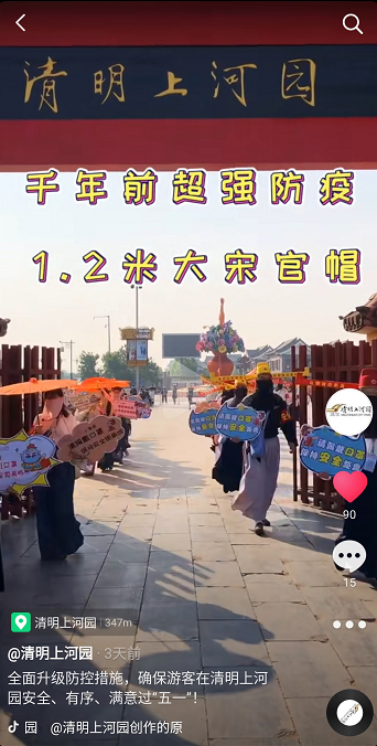 這個“五一”,清明上河園創(chuàng)新結(jié)合大宋文化和防疫需求,推出讓工作人員穿宋裝戴1.2米長帽翅的“宋式官帽”在園區(qū)巡視并提示游客,通過這種趣味性的方式提示游客保持距離、文明游覽,得到游客的一致好評,其中結(jié)合此創(chuàng)意拍攝的短視頻成為當(dāng)日新浪微博熱搜前40,累計(jì)播放量超過1000萬次。