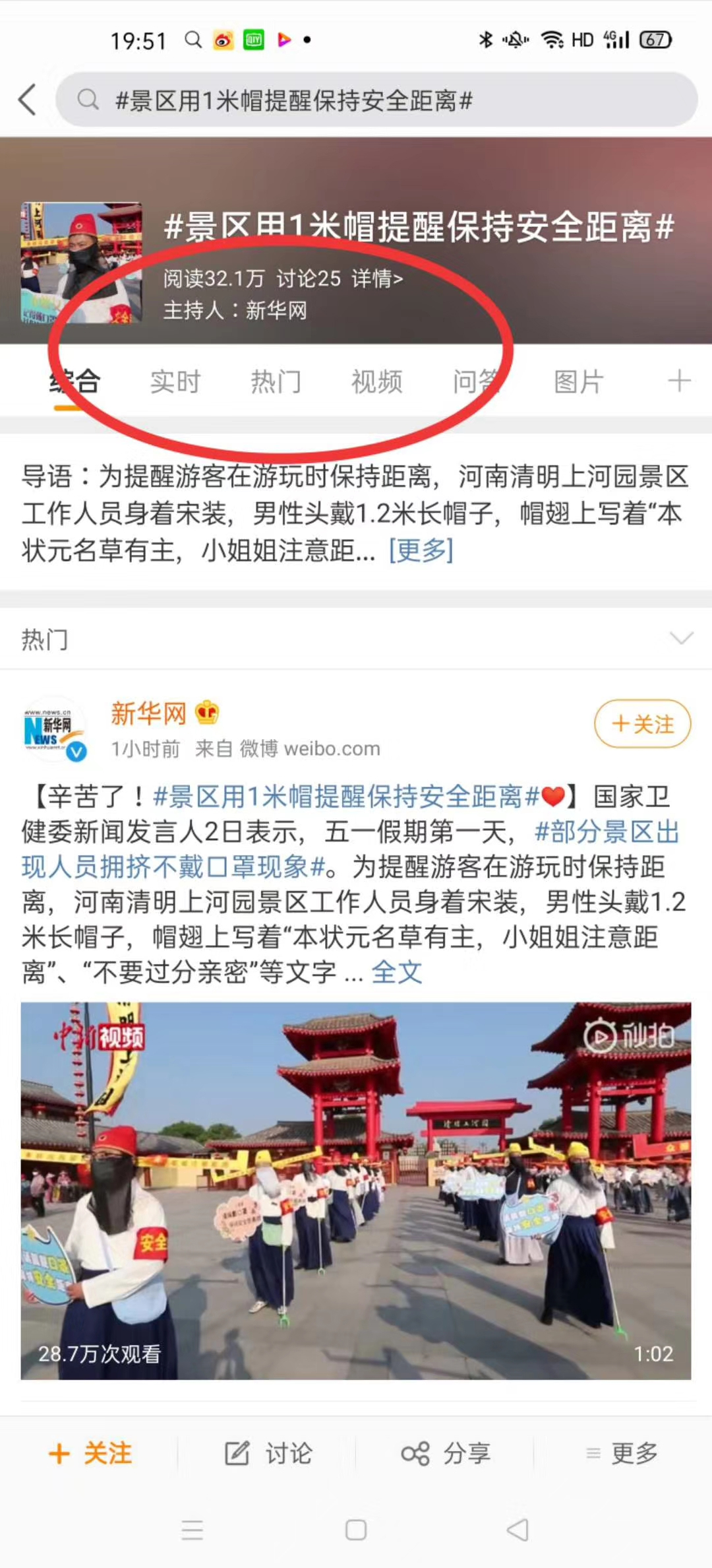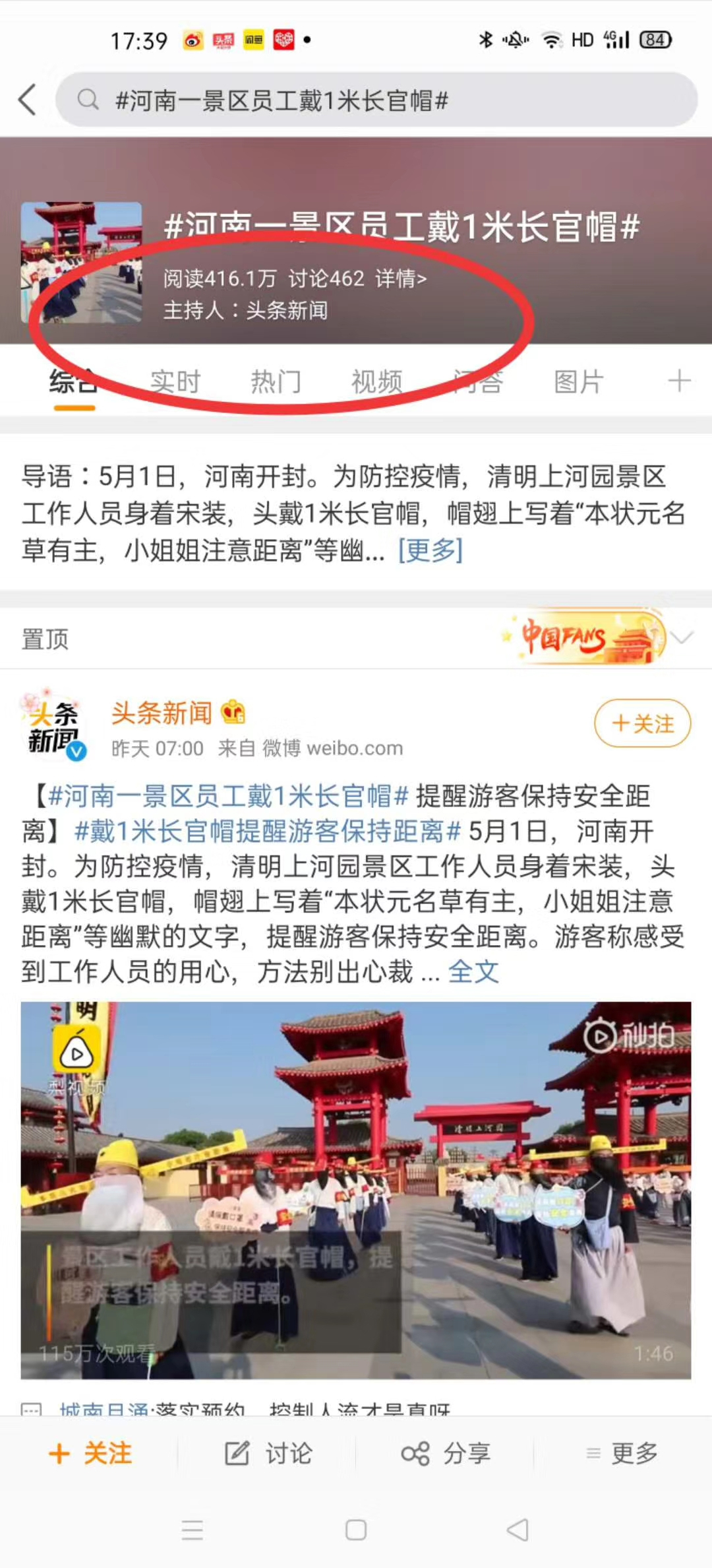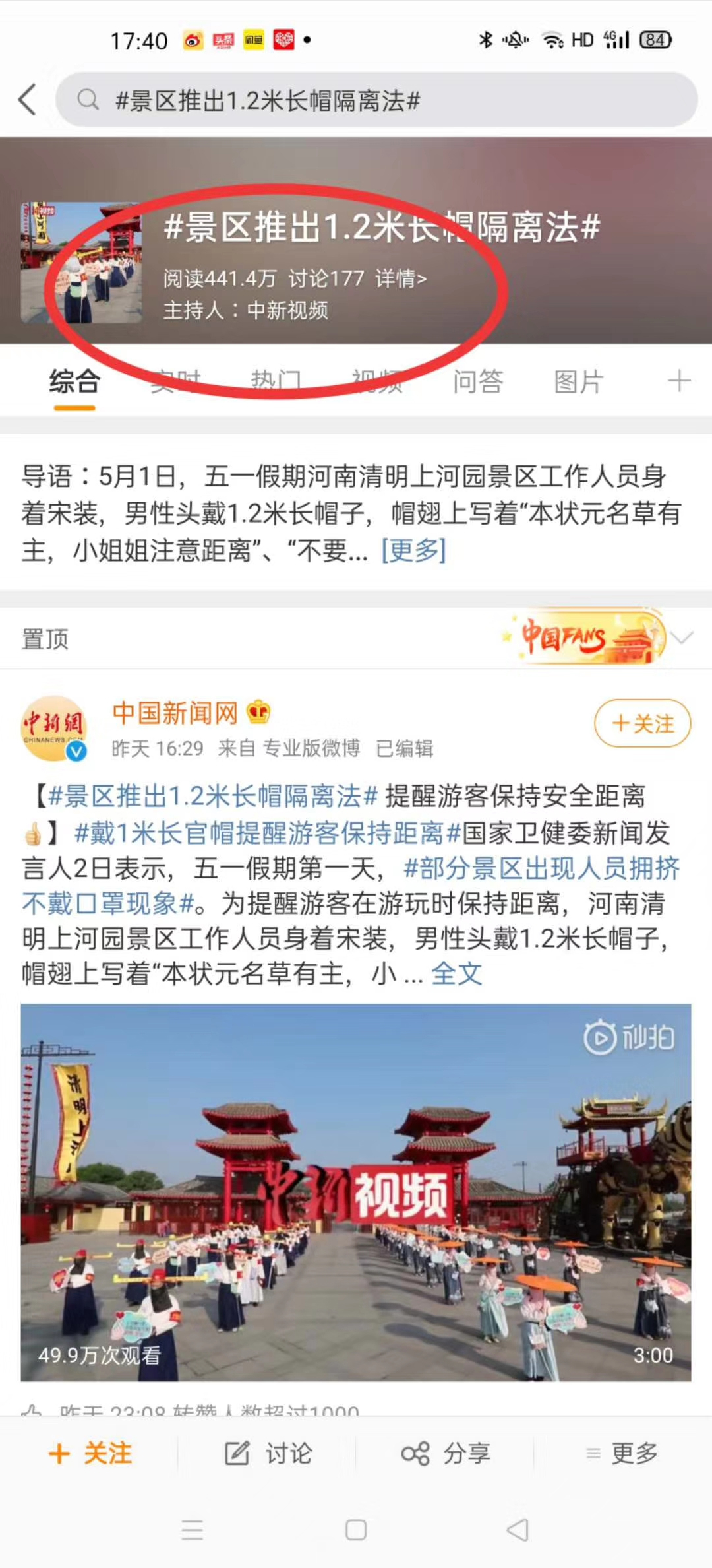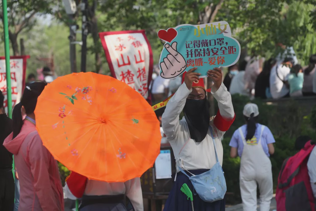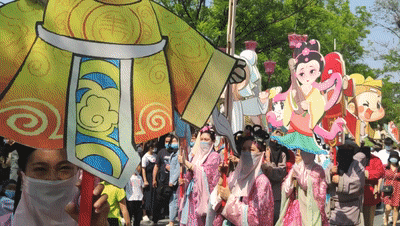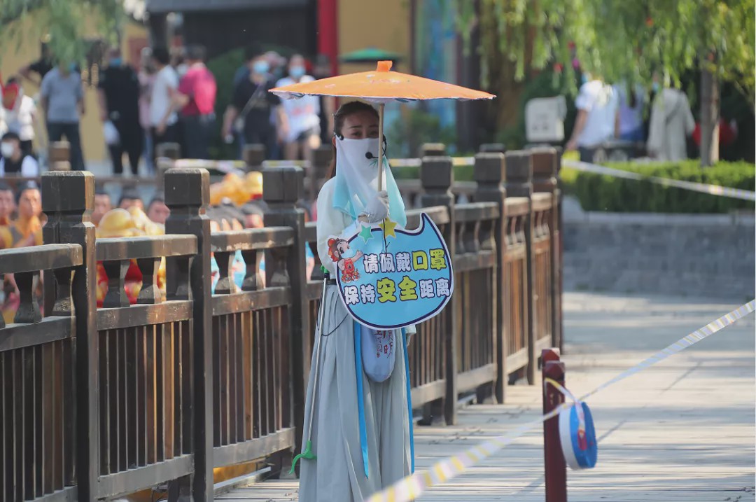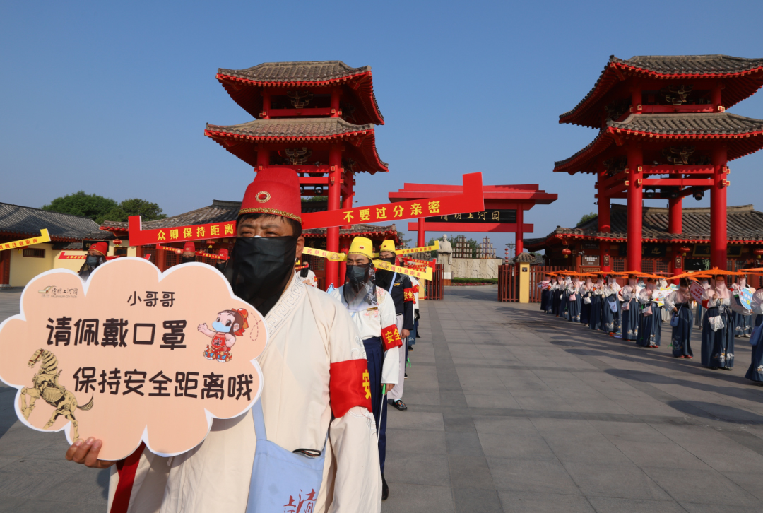 這個“五一”,清明上河園創(chuàng)新結(jié)合大宋文化和防疫需求,推出讓工作人員穿宋裝戴1.2米長帽翅的“宋式官帽”在園區(qū)巡視并提示游客,通過這種趣味性的方式提示游客保持距離、文明游覽,得到游客的一致好評,其中結(jié)合此創(chuàng)意拍攝的短視頻成為當(dāng)日新浪微博熱搜前40,累計(jì)播放量超過1000萬次。