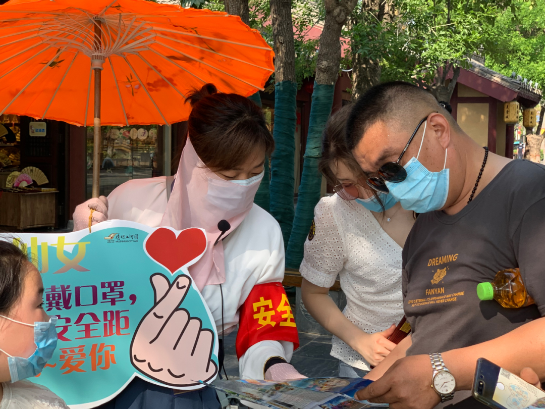 組織全體員工赴一線為游客提供面對面的服務(wù),特別是組織100名員工組成“綜合服務(wù)隊(duì)”在園區(qū)重點(diǎn)區(qū)域、重點(diǎn)線路、重要節(jié)點(diǎn)進(jìn)行現(xiàn)場引導(dǎo)和秩序維護(hù),每個人員均手持“游客保持安全距離、佩戴口罩”相關(guān)內(nèi)容的提示牌、佩戴較為醒目的“安全員”袖章,讓景區(qū)管理人員無處不在,同時(shí),所有人員均配備消殺用品為游客免費(fèi)提供,給沒有戴口罩的游客免費(fèi)發(fā)放口罩,確保游客安心游玩。