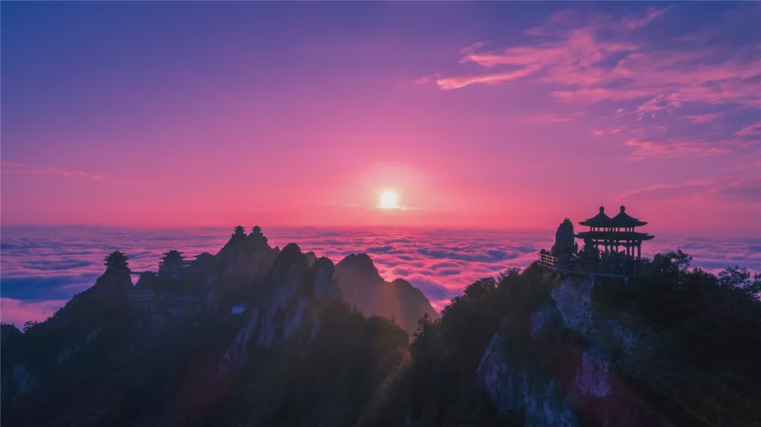 站在亮寶臺位置,以西邊玉皇頂為前景參照物拍日落。此位置適合拍云海、星軌、金殿、縣城、起伏的山巒,老君山最高峰——馬鬃嶺。