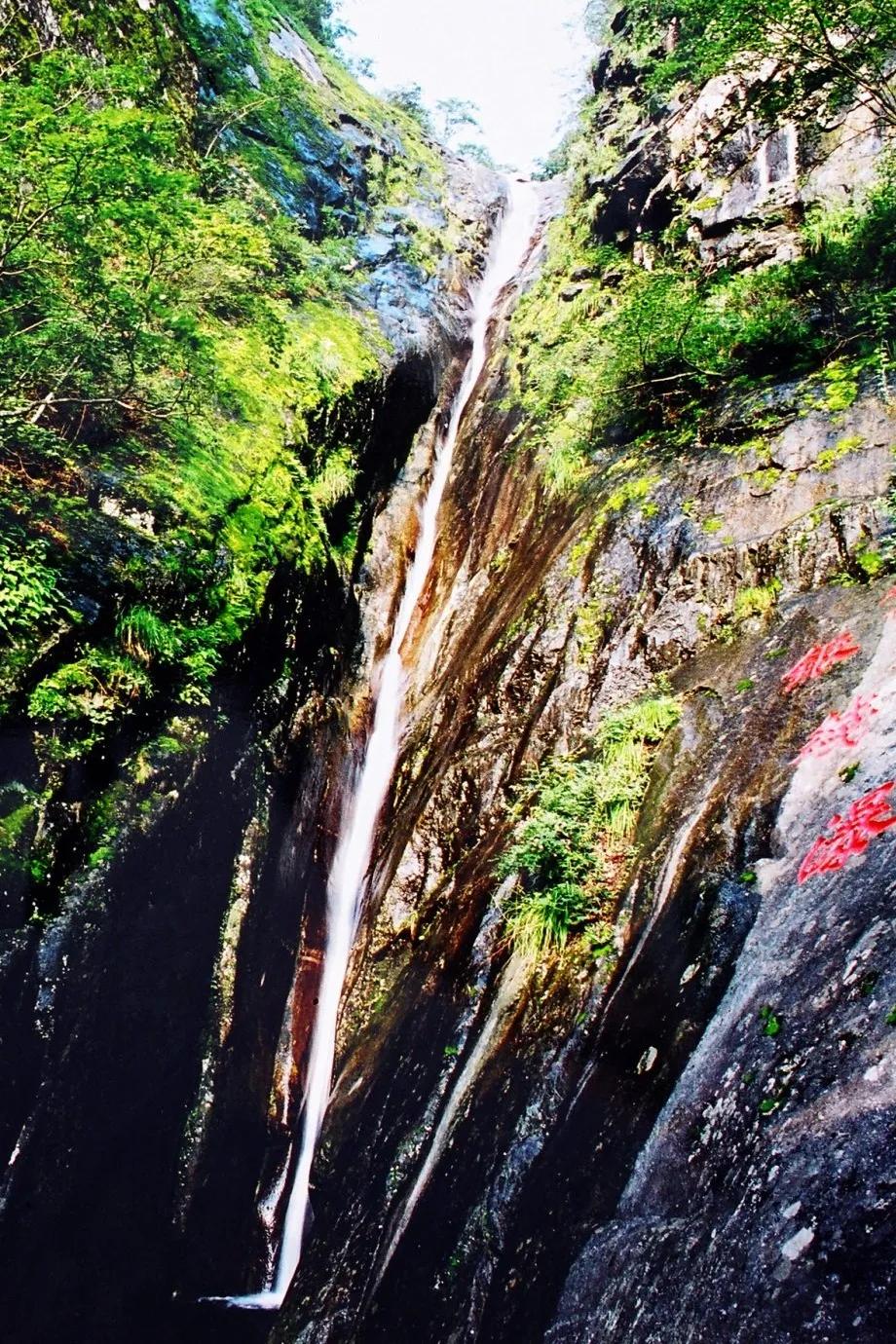 銀線瀑,從60米高的石壁上跌落,又細又直,宛如一條銀線從天而降。又因其細瘦,天下難覓,又稱“天下第一瘦瀑”。