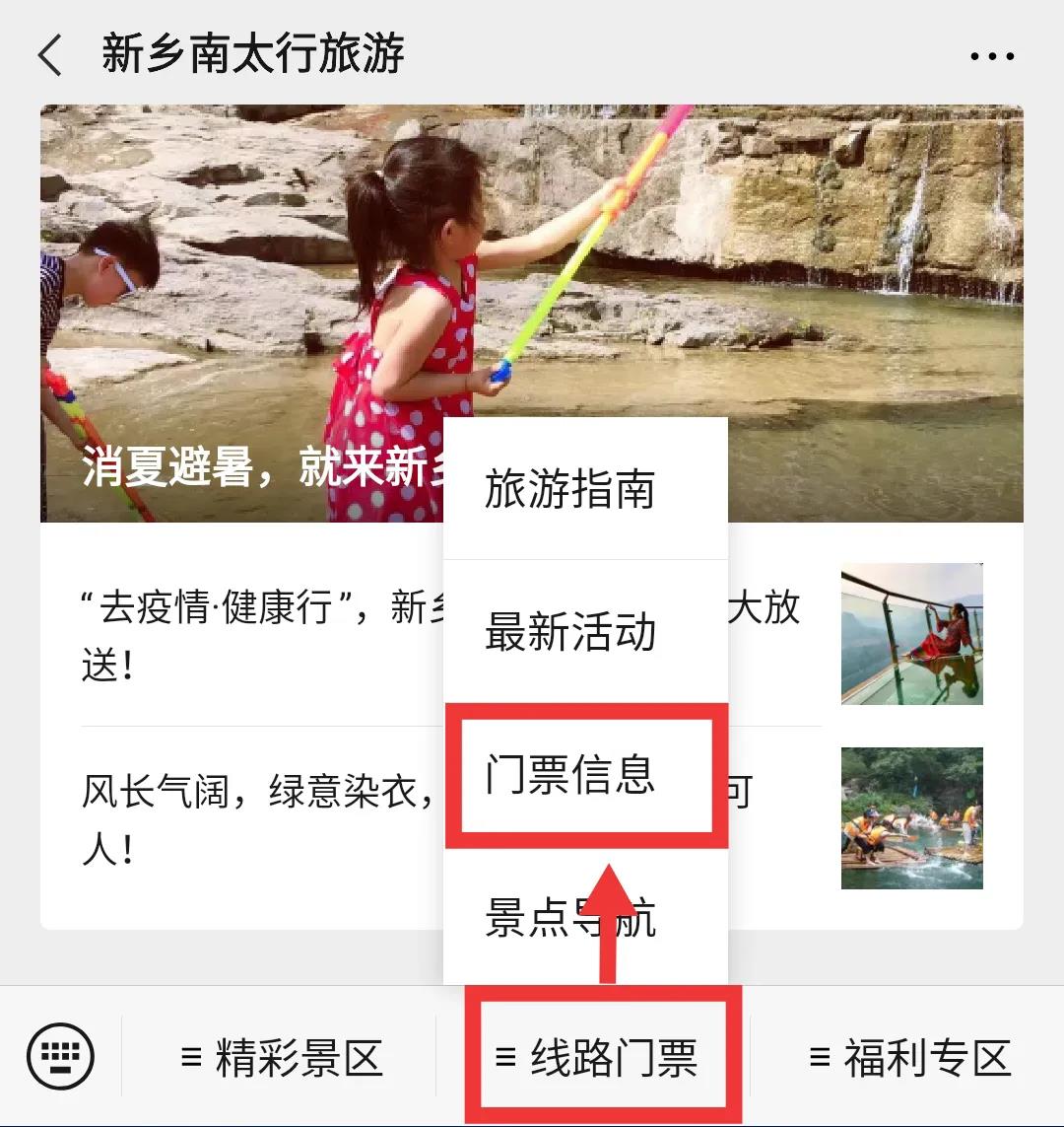 新鄉(xiāng)南太行旅游公眾號(hào),點(diǎn)擊菜單欄“線路門票”然后點(diǎn)擊“門票信息”
