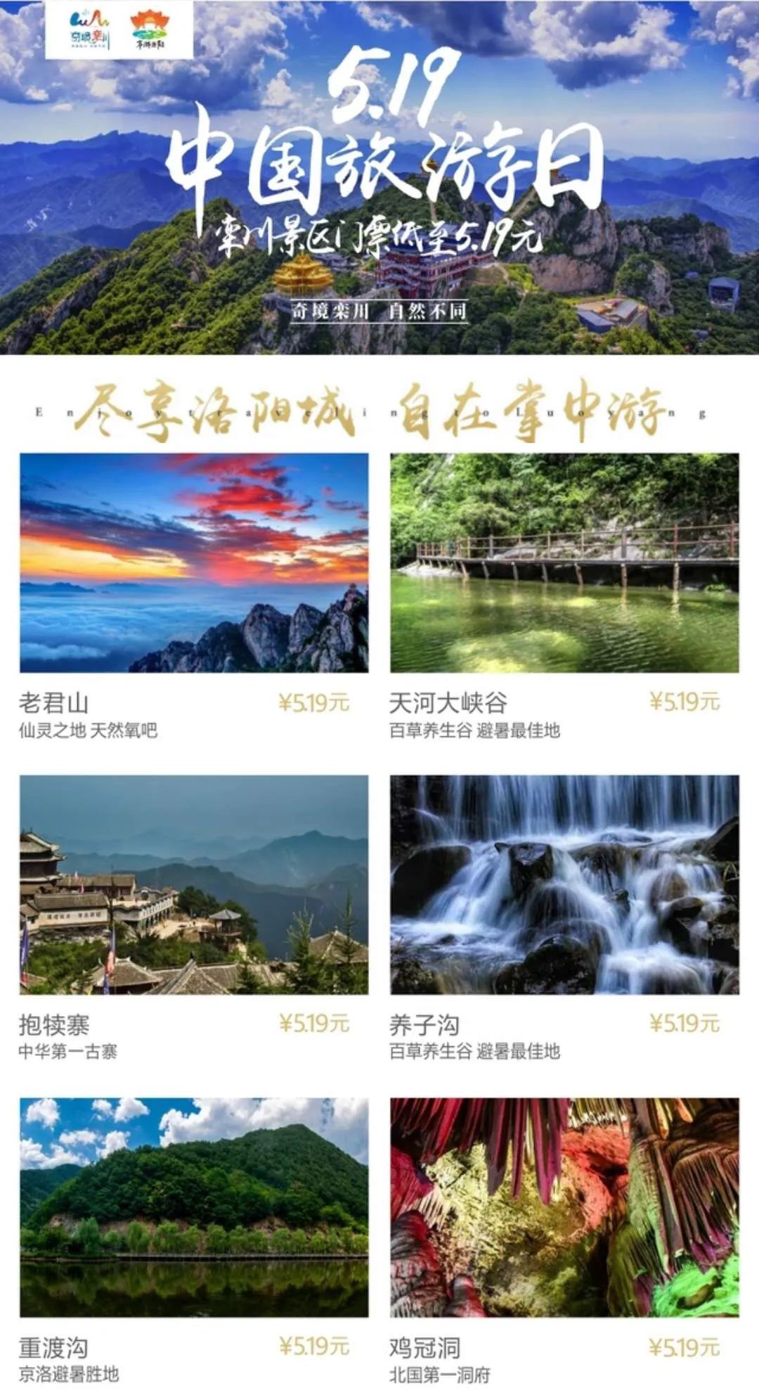 據(jù)悉,為慶祝中國旅游日,欒川縣舉行了多項(xiàng)惠民活動(dòng):5月19日當(dāng)天,全縣9個(gè)景區(qū)對(duì)河南省游客實(shí)行5.19元特價(jià)門票優(yōu)惠。