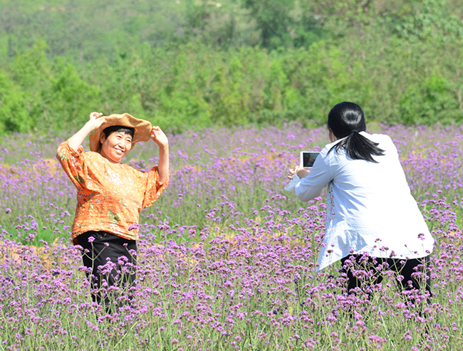 游客在花海賞花拍照