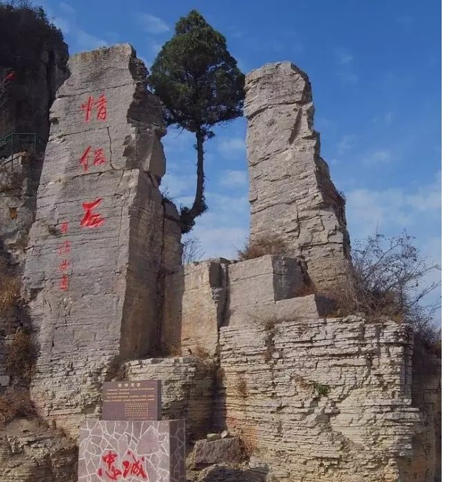 情侶石為兩塊相依偎的巨石,形似竊竊私語的戀人,又好似一對(duì)新婚夫婦相互凝望,上面的情侶石三字是由郭沫若先生題寫,下面的忠誠二字更是對(duì)愛情和婚姻的誓言。傳說來到這里的情侶、夫妻,定能在祖師爺?shù)谋S酉,幸福美滿、恩恩愛愛、白頭偕老。