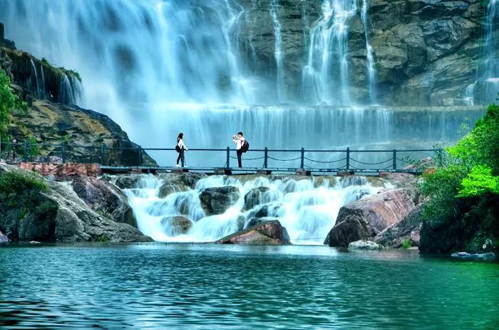 一大一小兩股瀑布自山間而下,匯聚成一股,水流清澈、水質(zhì)極佳。傳說用這里的水洗臉勻面,能求得一段好姻緣,所以頗受單身人士的喜愛。來關(guān)山還可和你愛的人在天柱峰扣上一枚同心鎖,許下愛的誓言。