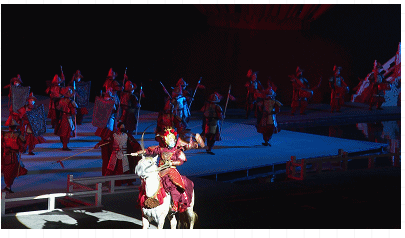 大宋不止有千嬌百媚的李師師,更有英姿颯爽的穆桂英。“穆”字大旗獵獵飛揚(yáng),策馬而來(lái)的巾幗英雄沖鋒陷陣,戰(zhàn)鼓如雷,駿馬似電,令人熱血沸騰。