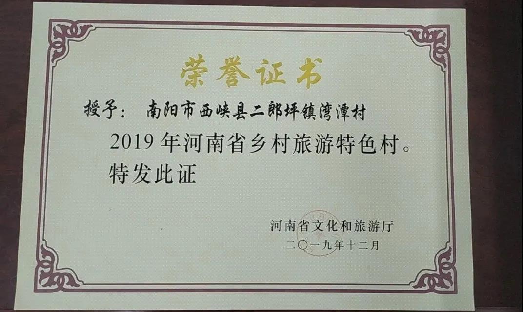 依托山清水秀的自然環(huán)境,灣潭村建起占地幾十畝的鄉(xiāng)村農(nóng)耕文化苑,與附近的農(nóng)家樂(lè)一起,初步形成景點(diǎn)、農(nóng)家樂(lè)、休閑游,深層次旅游鏈條。河南省文化文化旅游廳授予二郎坪鎮(zhèn)灣潭村,“2019年河南省鄉(xiāng)村旅游特色村”的稱號(hào)。