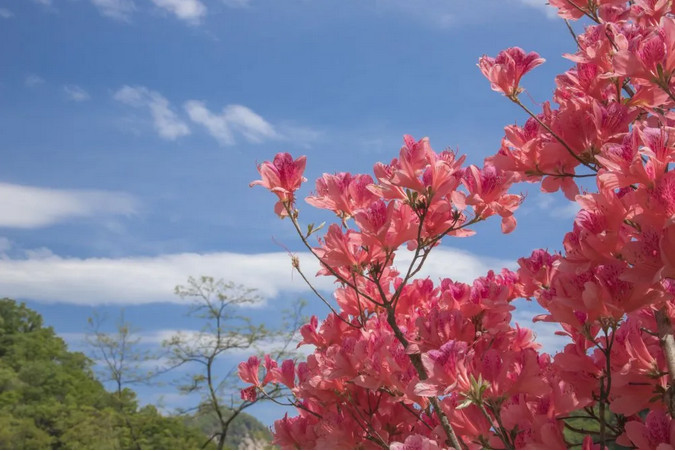 看,杜鵑怒放在山林,像穿著彩裙的仙女,風(fēng)姿絕艷,燦若云錦;