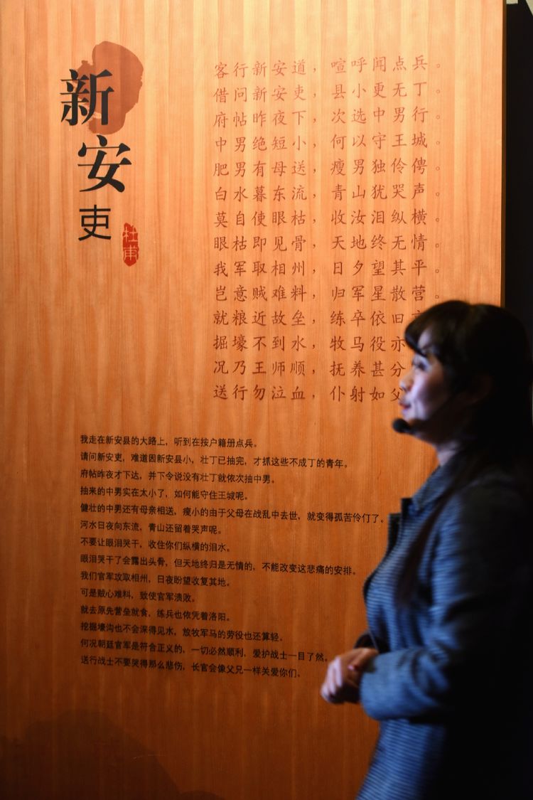 杜甫的詩歌具有穿越時空的巨大力量,其影響不僅是文學(xué)的也是社會的,不僅是歷史的也是現(xiàn)實的,不僅是中華的也是世界的,千載歷史的回音壁上,崇杜之聲不絕嗣響,這是河洛水土培育了詩人高尚的性情。其作品多涉民間疾苦,而其憂國憂民崇高情懷,千百年來贏得了后人的崇敬。在杜甫故里詩歌展區(qū),他寫于安史之亂時期的“三吏三別”,深刻地寫出了民間疾苦及在亂世之中身世飄蕩的孤獨,揭示了戰(zhàn)爭給人民帶來的巨大不幸和困苦,表達(dá)了杜甫對倍受戰(zhàn)禍摧殘的老百姓的同情。