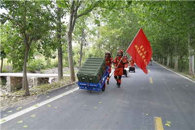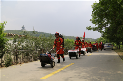 在徒步行進(jìn)科目中,地震救援隊(duì)攜帶全部裝備器材,采取肩背人扛的方式在高溫天氣下徒步行進(jìn)7公里,期間通過(guò)土路、河灘、山路,在第一時(shí)間抵達(dá)“災(zāi)區(qū)”,全面檢驗(yàn)消防指戰(zhàn)員快速攜裝行進(jìn)的能力。