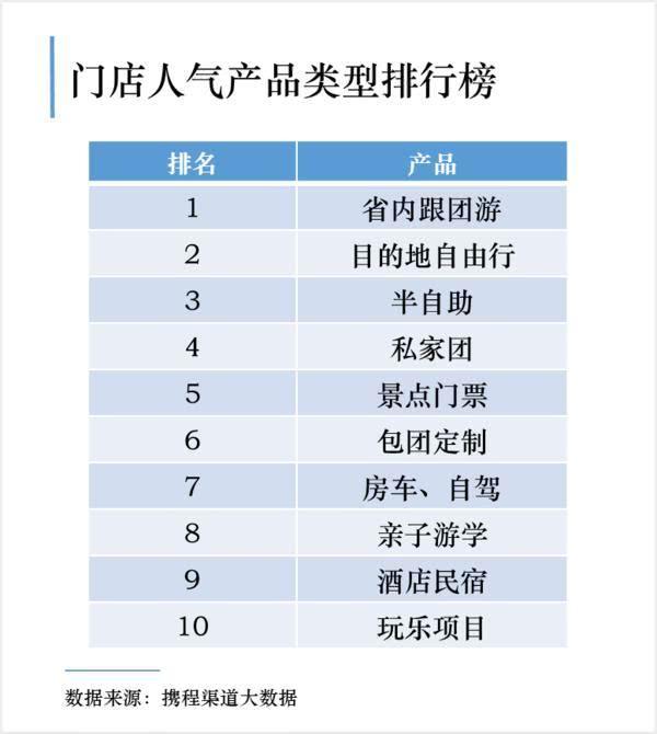 攜程發(fā)布的“5月門店人氣產(chǎn)品類型排行榜”顯示,十大人氣品類包括:省內(nèi)跟團(tuán)游、目的地自由行、半自助、私家團(tuán)、景點(diǎn)門票、包團(tuán)定制、房車與自駕游、親子游學(xué)、酒店民宿、玩樂項(xiàng)目。這也改變了門店以組織跟團(tuán)游為主歷史,在一些門店,一家三口或四口的家庭親子游已成為主力。