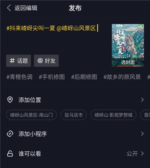 4、進入發(fā)布頁面,標題文字添加任務話題并@嵖岈山風景區(qū),點擊發(fā)布即為參與成功。
