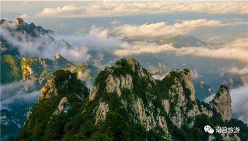2、南召五朵山。國家AAAA級景區(qū),五朵山位于南陽市南召縣西南部伏牛山東南麓,四棵樹鄉(xiāng)境內(nèi),距南召縣城38公里,南陽市區(qū)80公里,207國道轉(zhuǎn)景區(qū)旅游公路可達,是集道教文化、旅游觀光、休閑度假為一體的山岳型風(fēng)景旅游區(qū)。她是南陽伏牛山世界地質(zhì)公園的主要園區(qū)之一,南陽市十佳魅力景區(qū),景區(qū)總面積126平方公里,景區(qū)包含休閑戲水暴瀑峽、進香祈福萬福宮、登高攬勝五朵峰三大部分。 詩曰:五峰聯(lián)袂觸昊天,巉巖峭壁空中懸。參天古木群禽戲,碧草芳菲蜂蝶翩
