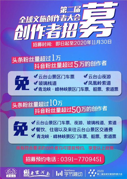 ●凡頭條粉絲量超過1萬、抖音粉絲量超過5萬的創(chuàng)作者,免云臺(tái)山景區(qū)門票、車票、云臺(tái)山夜游、索道、玻璃棧道等費(fèi)用,免費(fèi)暢游,同時(shí)免青龍峽·峰林峽景區(qū)門票、車票、船票、索道票等全部費(fèi)用;