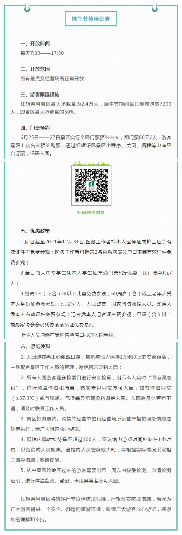 分時(shí)段預(yù)約、無(wú)接觸購(gòu)票入景、錯(cuò)高峰健康出行……端午佳節(jié),紅旗渠風(fēng)景區(qū)將繼續(xù)嚴(yán)守疫情防控標(biāo)準(zhǔn),嚴(yán)格落實(shí)防控措施,確保為廣大游客提供一個(gè)安全、舒適的旅游環(huán)境!