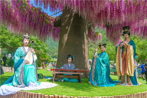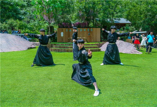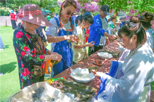 寶泉之新,源于創(chuàng)新。今年的端午,與“粽”不同。除了連續(xù)舉辦了六屆的高峽平湖龍舟賽活動外,寶泉景區(qū)圍繞傳統(tǒng)端午習俗,以“穿越春秋煙云、再現(xiàn)戰(zhàn)國市井”為主題,在景區(qū)桃花坪草坪廣場打造了一個場景化、沉浸式舞臺。近百位身著春秋戰(zhàn)國時期服飾、發(fā)飾、妝容的職業(yè)演員,惟妙惟肖地演繹了離騷故事、孔子講學、四美奏樂、仕女盞花、舞劍、香道、論茶、書法表演等春秋戰(zhàn)國市井文化市集。還有可以參與體驗的包粽子、制香囊、畫扇、投壺、七彩繩等端午民俗項目。步入場景,帶給你穿越千年時空的感覺!