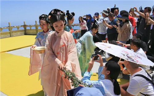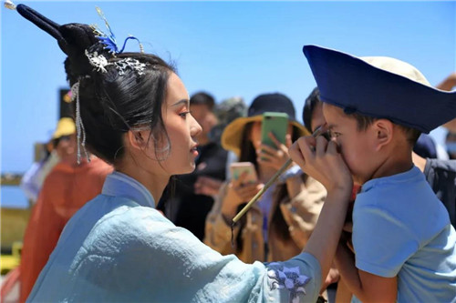 端午來老君山,哪兒能不畫額?五月初五,五毒蛇蟲活躍,老君山的仙女小姐姐給游客額頭點(diǎn)上一滴雄黃酒,消毒防病,蟲豸不盯。