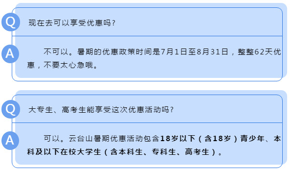 “?粕忾T票嗎?”“沒有身份證怎么辦?”“高考畢業(yè)生能享受這次優(yōu)惠活動嗎?”……6月27日,云臺山暑期優(yōu)惠政策發(fā)布之后,不少網(wǎng)友紛紛留言咨詢,今天,云臺山為你們一一解答!