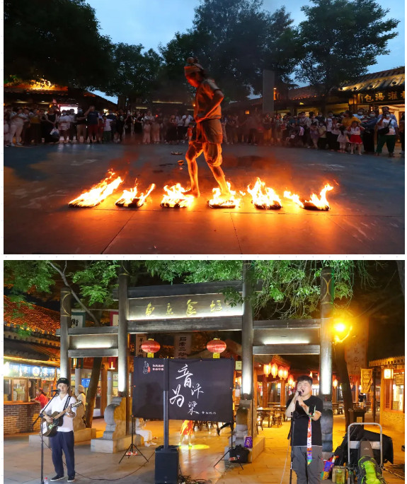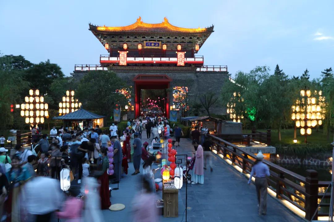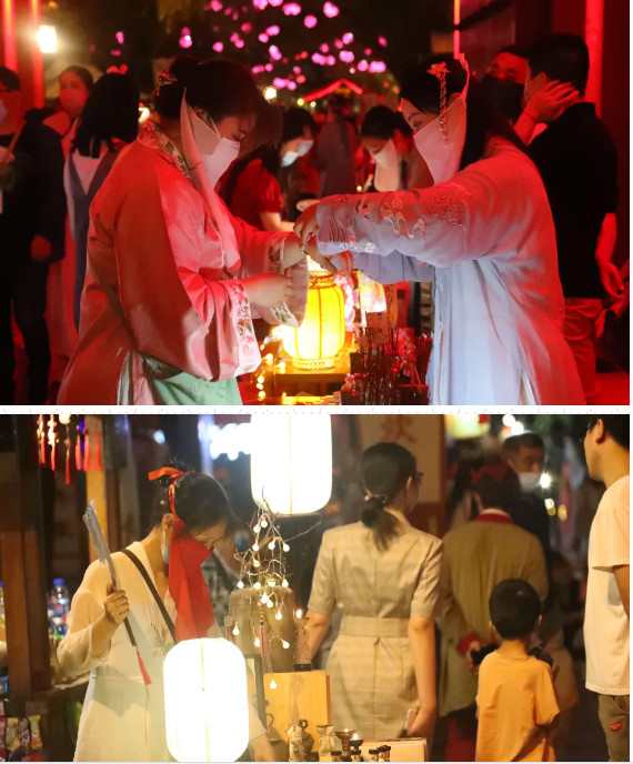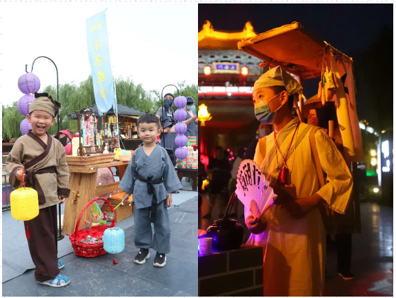 自6月19日起,每周五、周六,200多家商戶全部身著宋裝,在園區(qū)主要街道擺攤經(jīng)營(yíng),相聲、說(shuō)書、皮影等夜市小劇場(chǎng)沿街設(shè)立,商戶和游客一同融入《清明上河圖》的市井之中,感受別具一格的宋代夜市、地?cái)偵、人間煙火。