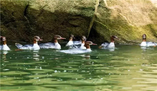 在水中嬉戲的中華秋沙鴨