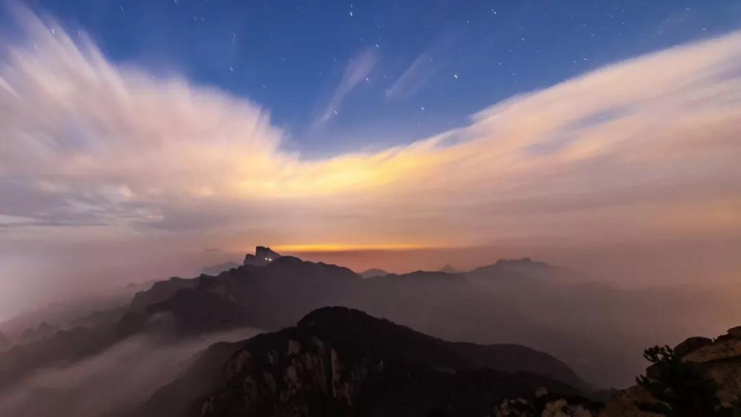 先苦后甜,或許就是對爬山的最好詮釋吧!一步一步往上爬,讓人暫時忘卻生活壓力,直至玉皇頂,一覽眾山小的感覺,有一種說不出的喜悅。日出是天堂,日落是仙境,暖黃色的光線,一層層的渲染,似乎一圈一圈地在蒸發(fā),把玉皇頂鍍上了一層金黃。