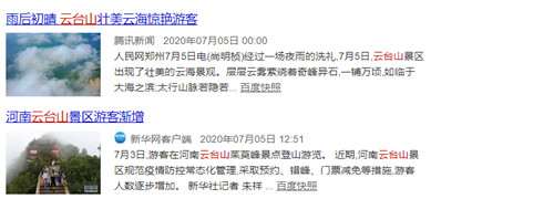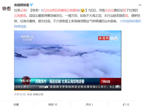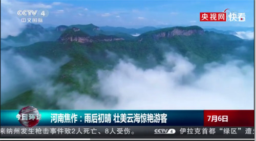 絕美驚艷的云海奇觀不僅刷爆了朋友圈,還在各大主流媒體中持續(xù)火爆,7月5日晚CCTV-2報道,云臺山現(xiàn)壯美云海;7月6日CCTV-4再次報道,雨后初晴 壯美云海驚艷游客;微博話題:#云臺山雨后初晴現(xiàn)云海景觀#,幾個小時內(nèi),閱讀量達(dá)到185.6W,各大主流媒體紛紛轉(zhuǎn)發(fā),直呼絕美!