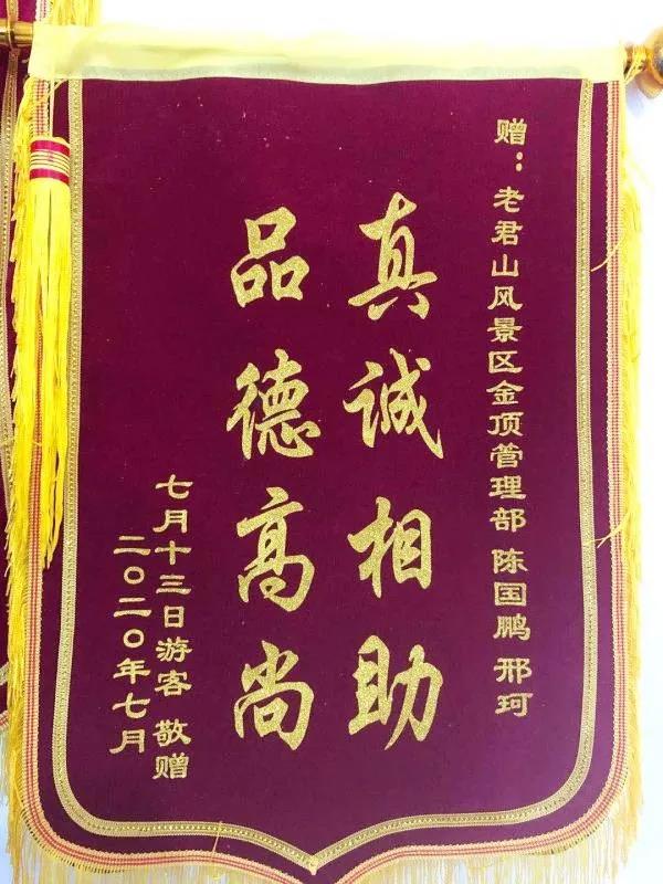 7月23日上午,老君山景區(qū)辦公室收到一面錦旗,上題:“真誠相助,品德高尚”。據(jù)悉,這是游客對景區(qū)工作人員幫其找回背包一事表示感謝。
