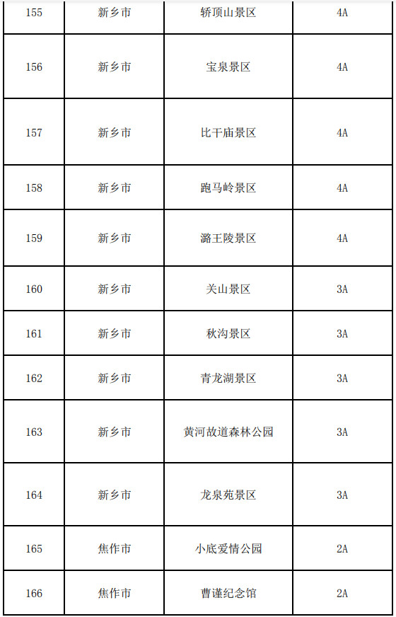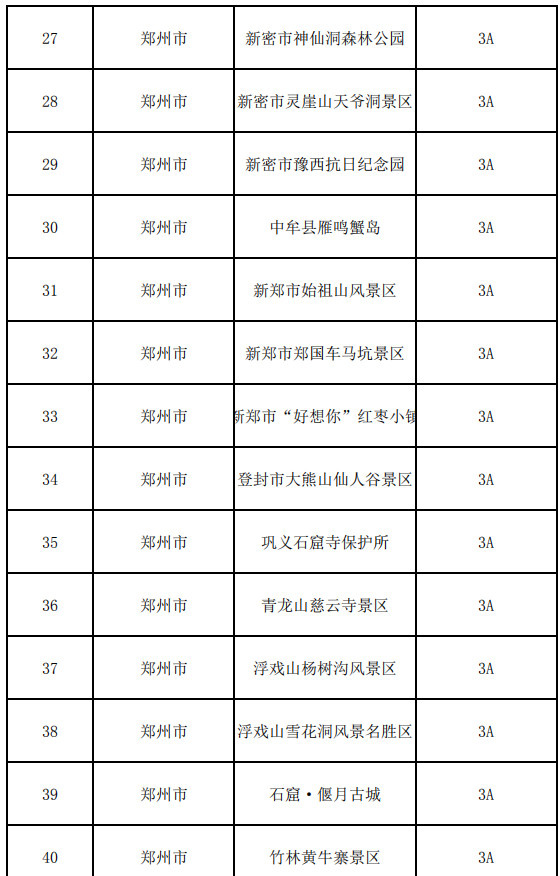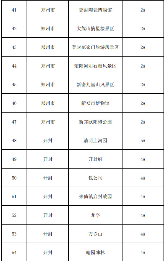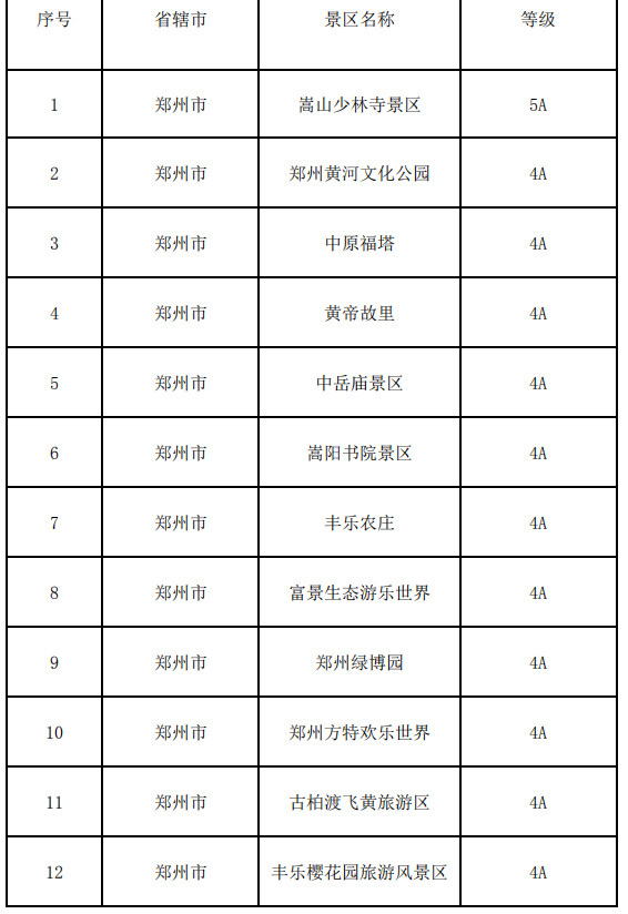 鄭州市:嵩山少林寺景區(qū)、鄭州黃河文化公園、中原福塔、黃帝故里、中岳廟景區(qū)、嵩陽(yáng)書院景區(qū)、豐樂(lè)農(nóng)莊、富景生態(tài)游樂(lè)世界、鄭州綠博園、鄭州方特歡樂(lè)世界、古柏渡飛黃旅游區(qū)、豐樂(lè)櫻花園旅游風(fēng)景區(qū)、伏羲山大峽谷景區(qū)、三泉湖景區(qū)、紅石林景區(qū)、銀基國(guó)際旅游度假區(qū)、二七區(qū)櫻桃溝旅游景區(qū)、鄭州園博園、康百萬(wàn)莊園、鞏義竹林景區(qū)、杜甫故里、黃河花園口旅游區(qū)、黃河逸園、鄭州城隍廟-文廟、鄭州海洋館景區(qū)、環(huán)翠峪風(fēng)景名勝區(qū)、新密市神仙洞森林公園、新密市靈崖山天爺洞景區(qū)、新密市豫西抗日紀(jì)念園、中牟縣雁鳴蟹島、新鄭市始祖山風(fēng)景區(qū)、新鄭市鄭國(guó)車馬坑景區(qū)、新鄭市“好想你”紅棗小鎮(zhèn)、登封市大熊山仙人谷景區(qū)、鞏義石窟寺保護(hù)所、青龍山慈云寺景區(qū)、浮戲山楊樹溝風(fēng)景區(qū)、浮戲山雪花洞風(fēng)景名勝區(qū)、石窟·偃月古城、竹林黃牛寨景區(qū)、登封陶瓷博物館、大熊山摘星樓景區(qū)、登封范家門旅游風(fēng)景區(qū)、滎陽(yáng)河陰石榴風(fēng)景區(qū)、新密九里山風(fēng)景區(qū)、新鄭市博物館、新鄭歐陽(yáng)修公園
